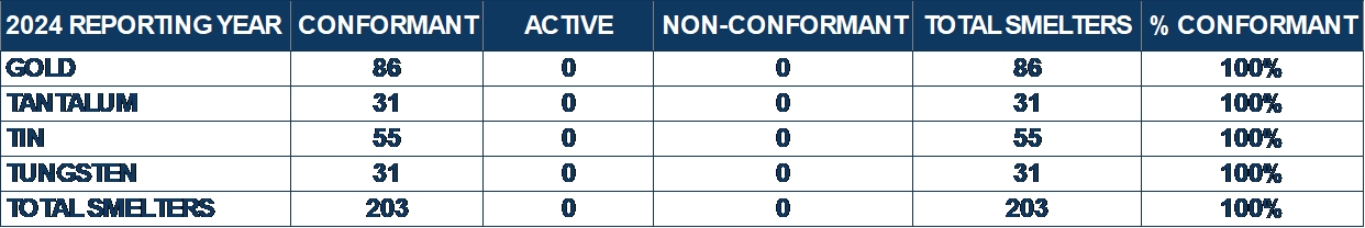 | • | The RMC Team reviews and updates its own company-level CMRT to identify risk in the supply chain for non-RMAP conformant smelters reported by 3TG suppliers in their submitted CMRTs. |