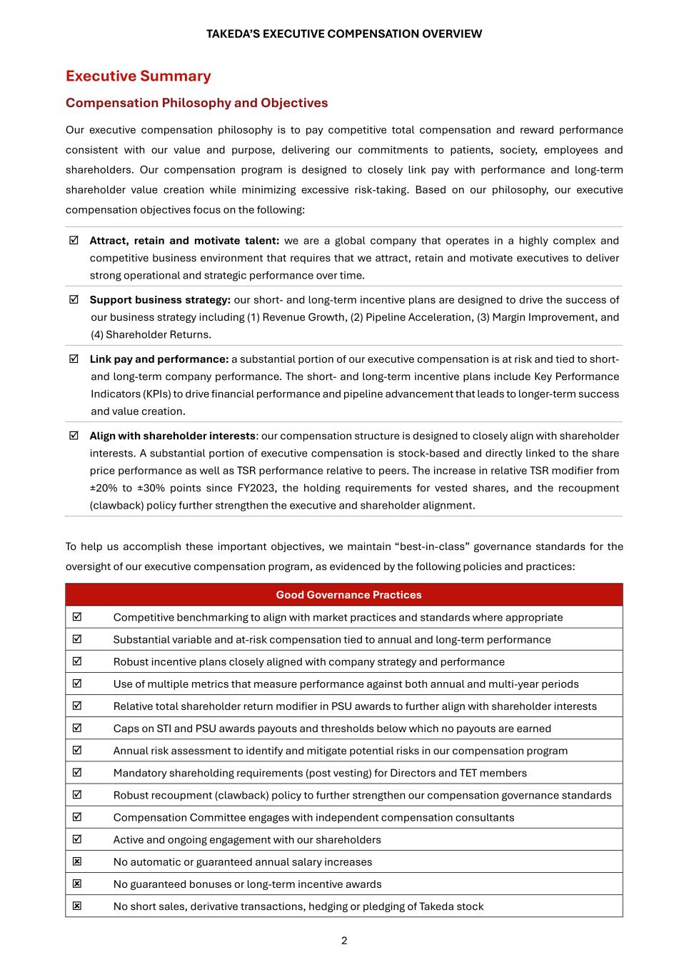 1 Better Health, Brighter Future TAKEDA’S EXECUTIVE COMPENSATION OVERVIEW Takeda’s executive compensation strategy supports our position as a patient-focused, values-based, R&D-driven global biopharmaceutical company. We have an experienced and diverse Takeda Executive Team (the “TET”), representing nine nationalities and located in three countries, which includes three of our Board of Directors (the “Internal Directors”) 1 . Our executive compensation program is designed to be globally competitive and performance-oriented, while also considering local market factors. Table of Contents Page Executive Summary 2 Compensation Philosophy and Objectives 3 Fiscal Year 2024 Business Performance Highlights R&D Performance Highlights Total Shareholder Return (TSR) Performance Relative to Peers Compensation Components 4 Base Salary 4 Short-Term Incentive (STI) 4 Long-Term Incentives (LTI) Performance Share Unit (PSU) Awards Restricted Stock Unit (RSU) Awards 5 STI Performance Metrics and Rationale 5 PSU Awards Performance Metrics and Rationale How We Link Pay and Performance 6 Pay and Performance Alignment: Pay Mix 6 Fiscal Year 2024 STI: Performance and Payout 8 Fiscal Year 2022-2024 PSU Awards: Performance and Payout 9 Recent Changes in Key Performance Indicators (KPIs) 10 KPIs for Fiscal Year 2025 STI and 2025-2027 PSU Awards Compensation Determination and Oversight 10 Roles and Activities of the Compensation Committee 11 Role of Independent Compensation Consultant 11 Comparative Framework and Peer Group 12 Compensation Determination How We Set Target Pay Compensation Determination for Internal Directors Compensation Determination for Other TET members 12 Key Performance Indicator (KPI) Determination 13 Compensation Risk Assessment Other Matters 13 Fiscal Year 2024 CEO Contractual Agreements 14 Shareholding Requirement 14 Recoupment (Clawback) Policy 15 Shareholder Engagement 1For details related to Takeda leadership, please refer to the Business Report in the Notice of Convocation of the 149th Annual General Meeting of Shareholders