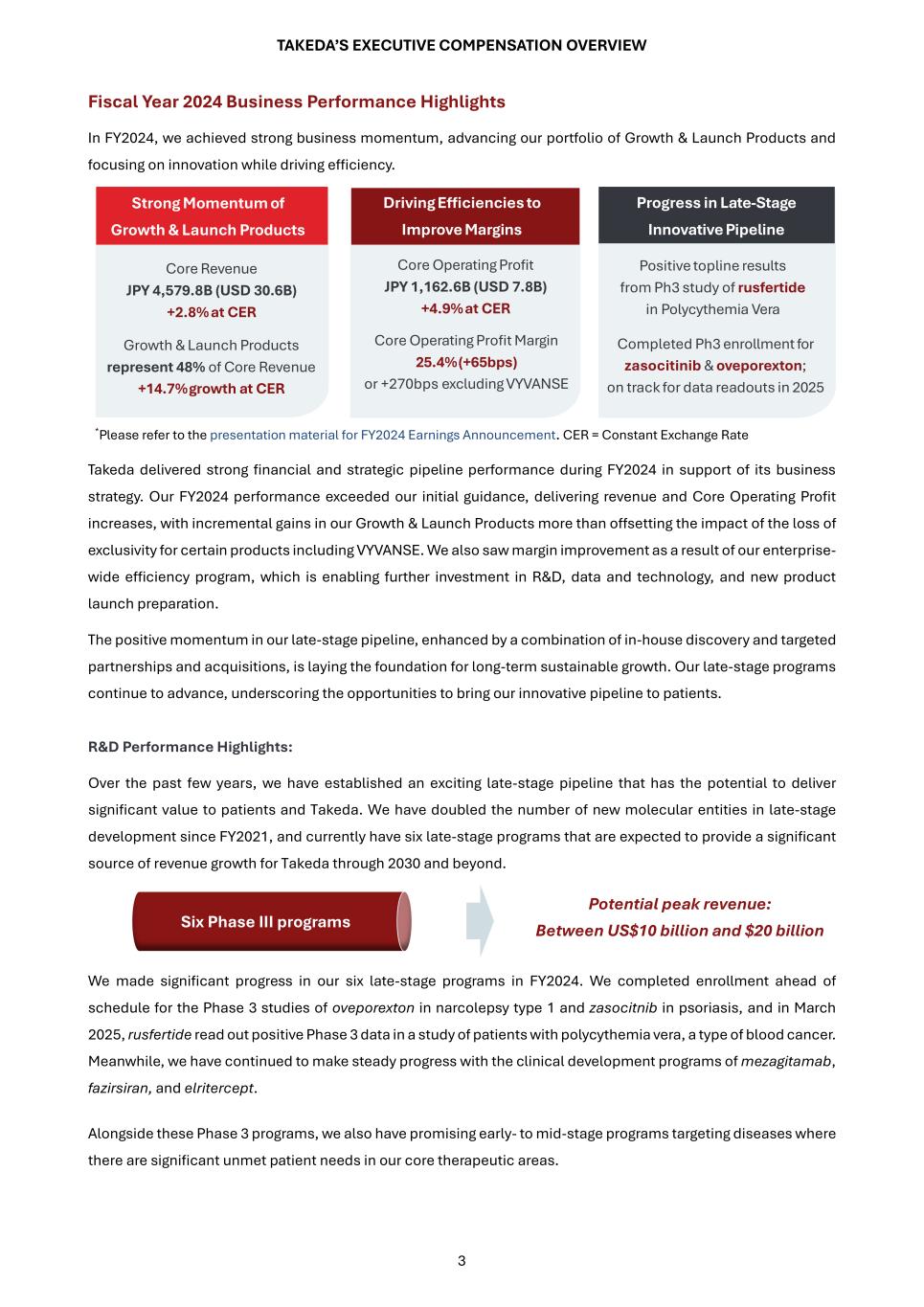 TAKEDA’S EXECUTIVE COMPENSATION OVERVIEW 3 Fiscal Year 2024 Business Performance Highlights In FY2024, we achieved strong business momentum, advancing our portfolio of Growth & Launch Products and focusing on innovation while driving efficiency. *Please refer to the presentation material for FY2024 Earnings Announcement. CER = Constant Exchange Rate Takeda delivered strong financial and strategic pipeline performance during FY2024 in support of its business strategy. Our FY2024 performance exceeded our initial guidance, delivering revenue and Core Operating Profit increases, with incremental gains in our Growth & Launch Products more than offsetting the impact of the loss of exclusivity for certain products including VYVANSE. We also saw margin improvement as a result of our enterprise- wide efficiency program, which is enabling further investment in R&D, data and technology, and new product launch preparation. The positive momentum in our late-stage pipeline, enhanced by a combination of in-house discovery and targeted partnerships and acquisitions, is laying the foundation for long-term sustainable growth. Our late-stage programs continue to advance, underscoring the opportunities to bring our innovative pipeline to patients. R&D Performance Highlights: Over the past few years, we have established an exciting late-stage pipeline that has the potential to deliver significant value to patients and Takeda. We have doubled the number of new molecular entities in late-stage development since FY2021, and currently have six late-stage programs that are expected to provide a significant source of revenue growth for Takeda through 2030 and beyond. Potential peak revenue: Between US$10 billion and $20 billion We made significant progress in our six late-stage programs in FY2024. We completed enrollment ahead of schedule for the Phase 3 studies of oveporexton in narcolepsy type 1 and zasocitnib in psoriasis, and in March 2025, rusfertide read out positive Phase 3 data in a study of patients with polycythemia vera, a type of blood cancer. Meanwhile, we have continued to make steady progress with the clinical development programs of mezagitamab, fazirsiran, and elritercept. Alongside these Phase 3 programs, we also have promising early- to mid-stage programs targeting diseases where there are significant unmet patient needs in our core therapeutic areas. Strong Momentum of Growth & Launch Products Progress in Late-Stage Innovative Pipeline Driving Efficiencies to Improve Margins Core Revenue JPY 4,579.8B (USD 30.6B) +2.8% at CER Growth & Launch Products represent 48% of Core Revenue +14.7% growth at CER Core Operating Profit JPY 1,162.6B (USD 7.8B) +4.9% at CER Core Operating Profit Margin 25.4% (+65bps) or +270bps excluding VYVANSE Positive topline results from Ph3 study of rusfertide in Polycythemia Vera Completed Ph3 enrollment for zasocitinib & oveporexton; on track for data readouts in 2025 Six Phase III programs