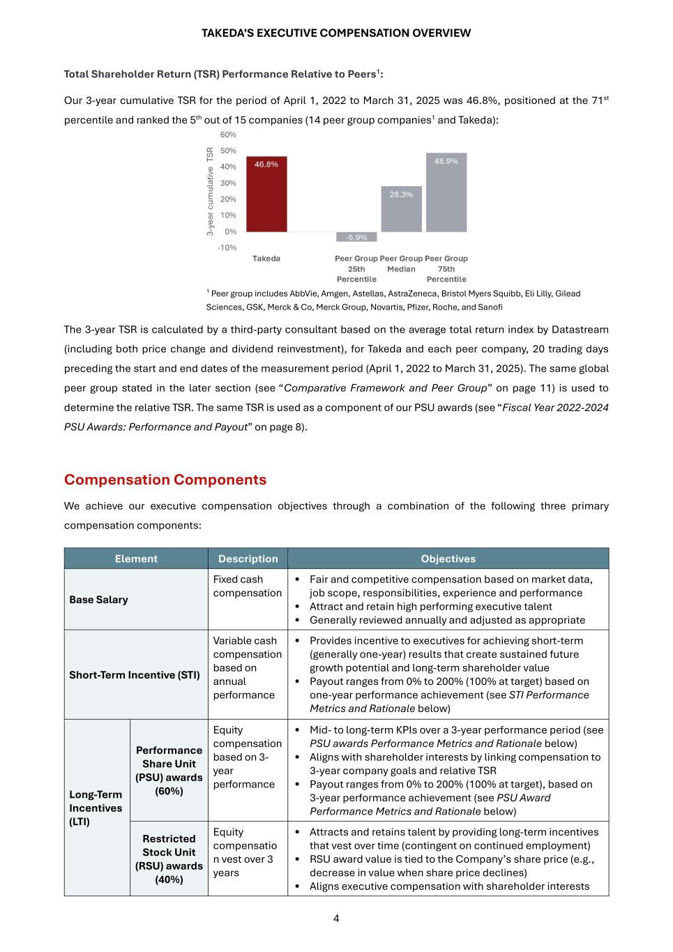 TAKEDA’S EXECUTIVE COMPENSATION OVERVIEW 4 Total Shareholder Return (TSR) Performance Relative to Peers1: Our 3-year cumulative TSR for the period of April 1, 2022 to March 31, 2025 was 46.8%, positioned at the 71st percentile and ranked the 5th out of 15 companies (14 peer group companies1 and Takeda): 1 Peer group includes AbbVie, Amgen, Astellas, AstraZeneca, Bristol Myers Squibb, Eli Lilly, Gilead Sciences, GSK, Merck & Co, Merck Group, Novartis, Pfizer, Roche, and Sanofi The 3-year TSR is calculated by a third-party consultant based on the average total return index by Datastream (including both price change and dividend reinvestment), for Takeda and each peer company, 20 trading days preceding the start and end dates of the measurement period (April 1, 2022 to March 31, 2025). The same global peer group stated in the later section (see “Comparative Framework and Peer Group” on page 11) is used to determine the relative TSR. The same TSR is used as a component of our PSU awards (see “Fiscal Year 2022-2024 PSU Awards: Performance and Payout” on page 8). Compensation Components We achieve our executive compensation objectives through a combination of the following three primary compensation components: Element Description Objectives Base Salary Fixed cash compensation • Fair and competitive compensation based on market data, job scope, responsibilities, experience and performance • Attract and retain high performing executive talent • Generally reviewed annually and adjusted as appropriate Short-Term Incentive (STI) Variable cash compensation based on annual performance • Provides incentive to executives for achieving short-term (generally one-year) results that create sustained future growth potential and long-term shareholder value • Payout ranges from 0% to 200% (100% at target) based on one-year performance achievement (see STI Performance Metrics and Rationale below) Long-Term Incentives (LTI) Performance Share Unit (PSU) awards (60%) Equity compensation based on 3- year performance • Mid- to long-term KPIs over a 3-year performance period (see PSU awards Performance Metrics and Rationale below) • Aligns with shareholder interests by linking compensation to 3-year company goals and relative TSR • Payout ranges from 0% to 200% (100% at target), based on 3-year performance achievement (see PSU Award Performance Metrics and Rationale below) Restricted Stock Unit (RSU) awards (40%) Equity compensatio n vest over 3 years • Attracts and retains talent by providing long-term incentives that vest over time (contingent on continued employment) • RSU award value is tied to the Company’s share price (e.g., decrease in value when share price declines) • Aligns executive compensation with shareholder interests