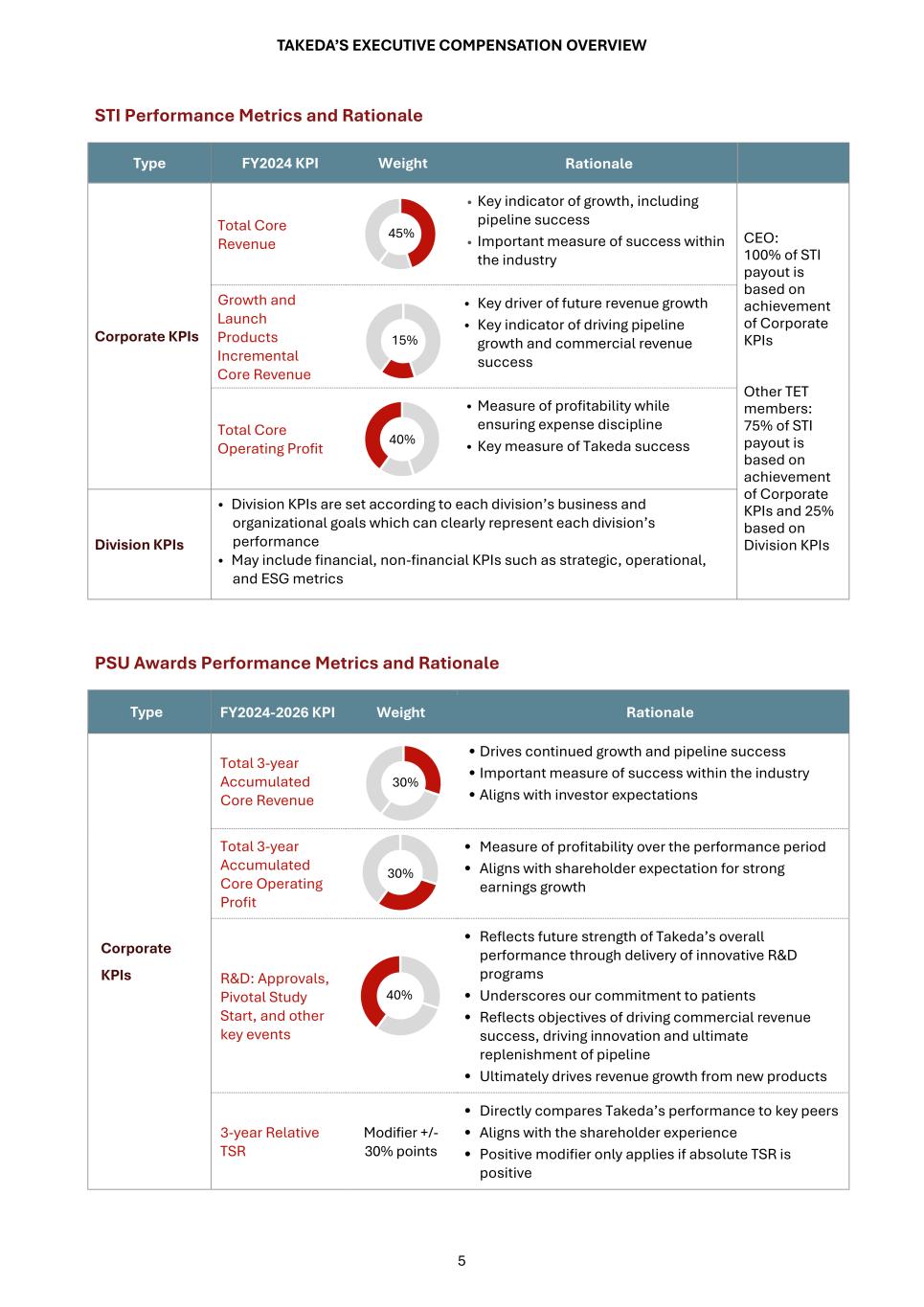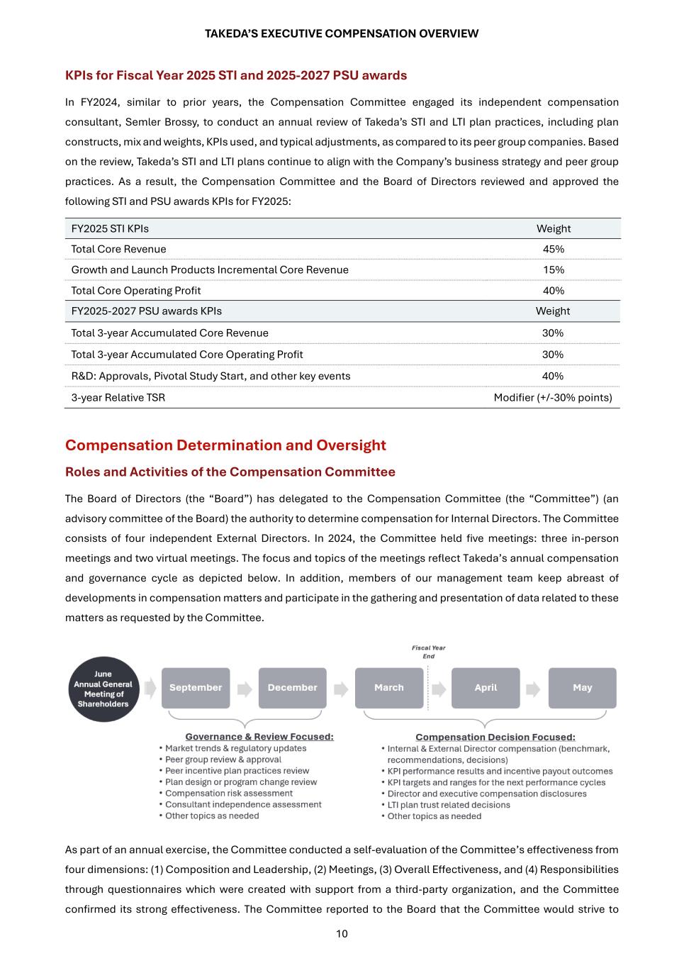 TAKEDA’S EXECUTIVE COMPENSATION OVERVIEW 10 KPIs for Fiscal Year 2025 STI and 2025-2027 PSU awards In FY2024, similar to prior years, the Compensation Committee engaged its independent compensation consultant, Semler Brossy, to conduct an annual review of Takeda’s STI and LTI plan practices, including plan constructs, mix and weights, KPIs used, and typical adjustments, as compared to its peer group companies. Based on the review, Takeda’s STI and LTI plans continue to align with the Company’s business strategy and peer group practices. As a result, the Compensation Committee and the Board of Directors reviewed and approved the following STI and PSU awards KPIs for FY2025: FY2025 STI KPIs Weight Total Core Revenue 45% Growth and Launch Products Incremental Core Revenue 15% Total Core Operating Profit 40% FY2025-2027 PSU awards KPIs Weight Total 3-year Accumulated Core Revenue 30% Total 3-year Accumulated Core Operating Profit 30% R&D: Approvals, Pivotal Study Start, and other key events 40% 3-year Relative TSR Modifier (+/-30% points) Compensation Determination and Oversight Roles and Activities of the Compensation Committee The Board of Directors (the “Board”) has delegated to the Compensation Committee (the “Committee”) (an advisory committee of the Board) the authority to determine compensation for Internal Directors. The Committee consists of four independent External Directors. In 2024, the Committee held five meetings: three in-person meetings and two virtual meetings. The focus and topics of the meetings reflect Takeda’s annual compensation and governance cycle as depicted below. In addition, members of our management team keep abreast of developments in compensation matters and participate in the gathering and presentation of data related to these matters as requested by the Committee. As part of an annual exercise, the Committee conducted a self-evaluation of the Committee’s effectiveness from four dimensions: (1) Composition and Leadership, (2) Meetings, (3) Overall Effectiveness, and (4) Responsibilities through questionnaires which were created with support from a third-party organization, and the Committee confirmed its strong effectiveness. The Committee reported to the Board that the Committee would strive to
