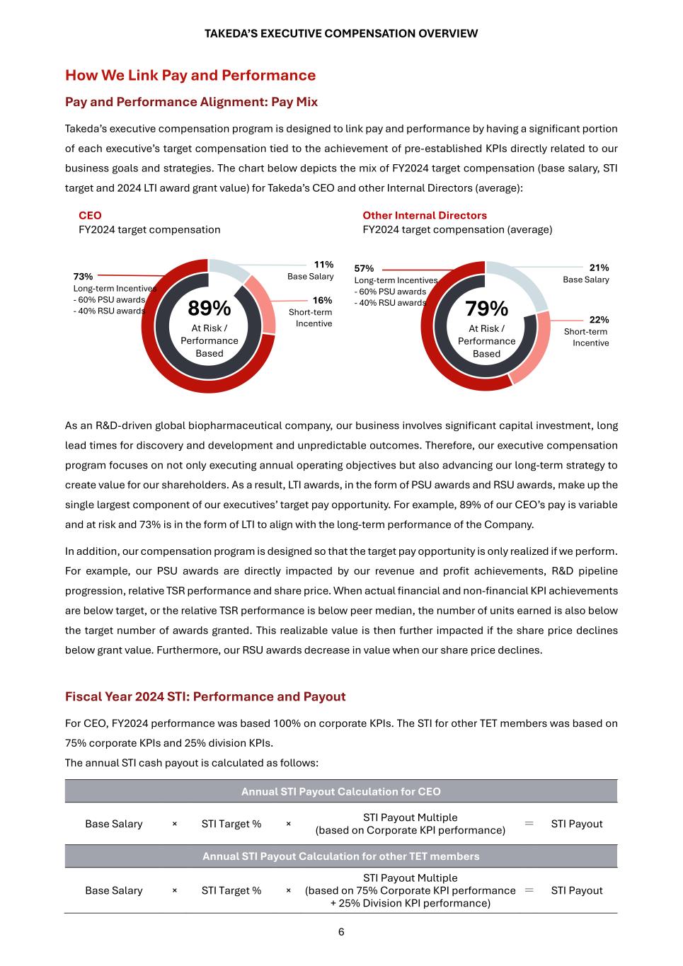 TAKEDA’S EXECUTIVE COMPENSATION OVERVIEW 6 How We Link Pay and Performance Pay and Performance Alignment: Pay Mix Takeda’s executive compensation program is designed to link pay and performance by having a significant portion of each executive’s target compensation tied to the achievement of pre-established KPIs directly related to our business goals and strategies. The chart below depicts the mix of FY2024 target compensation (base salary, STI target and 2024 LTI award grant value) for Takeda’s CEO and other Internal Directors (average): As an R&D-driven global biopharmaceutical company, our business involves significant capital investment, long lead times for discovery and development and unpredictable outcomes. Therefore, our executive compensation program focuses on not only executing annual operating objectives but also advancing our long-term strategy to create value for our shareholders. As a result, LTI awards, in the form of PSU awards and RSU awards, make up the single largest component of our executives’ target pay opportunity. For example, 89% of our CEO’s pay is variable and at risk and 73% is in the form of LTI to align with the long-term performance of the Company. In addition, our compensation program is designed so that the target pay opportunity is only realized if we perform. For example, our PSU awards are directly impacted by our revenue and profit achievements, R&D pipeline progression, relative TSR performance and share price. When actual financial and non-financial KPI achievements are below target, or the relative TSR performance is below peer median, the number of units earned is also below the target number of awards granted. This realizable value is then further impacted if the share price declines below grant value. Furthermore, our RSU awards decrease in value when our share price declines. Fiscal Year 2024 STI: Performance and Payout For CEO, FY2024 performance was based 100% on corporate KPIs. The STI for other TET members was based on 75% corporate KPIs and 25% division KPIs. The annual STI cash payout is calculated as follows: Annual STI Payout Calculation for CEO Base Salary × STI Target % × STI Payout Multiple (based on Corporate KPI performance) = STI Payout Annual STI Payout Calculation for other TET members Base Salary × STI Target % × STI Payout Multiple (based on 75% Corporate KPI performance + 25% Division KPI performance) = STI Payout CEO FY2024 target compensation 89% At Risk / Performance Based 11% Base Salary 16% Short-term Incentive 73% Long-term Incentives - 60% PSU awards - 40% RSU awards Other Internal Directors FY2024 target compensation (average) 79% At Risk / Performance Based 21% Base Salary 22% Short-term Incentive 57% Long-term Incentives - 60% PSU awards - 40% RSU awards