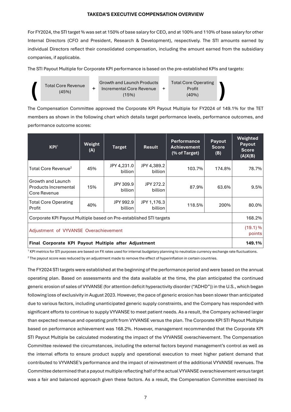 TAKEDA’S EXECUTIVE COMPENSATION OVERVIEW 7 For FY2024, the STI target % was set at 150% of base salary for CEO, and at 100% and 110% of base salary for other Internal Directors (CFO and President, Research & Development), respectively. The STI amounts earned by individual Directors reflect their consolidated compensation, including the amount earned from the subsidiary companies, if applicable. The STI Payout Multiple for Corporate KPI performance is based on the pre-established KPIs and targets: The Compensation Committee approved the Corporate KPI Payout Multiple for FY2024 of 149.1% for the TET members as shown in the following chart which details target performance levels, performance outcomes, and performance outcome scores: 1 KPI metrics for STI purposes are based on FX rates used for internal budgetary planning to neutralize currency exchange rate fluctuations. 2 The payout score was reduced by an adjustment made to remove the effect of hyperinflation in certain countries. The FY2024 STI targets were established at the beginning of the performance period and were based on the annual operating plan. Based on assessments and the data available at the time, the plan anticipated the continued generic erosion of sales of VYVANSE (for attention deficit hyperactivity disorder (“ADHD”)) in the U.S., which began following loss of exclusivity in August 2023. However, the pace of generic erosion has been slower than anticipated due to various factors, including unanticipated generic supply constraints, and the Company has responded with significant efforts to continue to supply VYVANSE to meet patient needs. As a result, the Company achieved larger than expected revenue and operating profit from VYVANSE versus the plan. The Corporate KPI STI Payout Multiple based on performance achievement was 168.2%. However, management recommended that the Corporate KPI STI Payout Multiple be calculated moderating the impact of the VYVANSE overachievement. The Compensation Committee reviewed the circumstances, including the external factors beyond management’s control as well as the internal efforts to ensure product supply and operational execution to meet higher patient demand that contributed to VYVANSE’s performance and the impact of reinvestment of the additional VYVANSE revenues. The Committee determined that a payout multiple reflecting half of the actual VYVANSE overachievement versus target was a fair and balanced approach given these factors. As a result, the Compensation Committee exercised its ( Total Core Revenue (45%) + Growth and Launch Products Incremental Core Revenue (15%) + Total Core Operating Profit (40%) ) KPI1 Weight (A) Target Result Performance Achievement (% of Target) Payout Score (B) Weighted Payout Score (A)X(B) Total Core Revenue2 45% JPY 4,231.0 billion JPY 4,389.2 billion 103.7% 174.8% 78.7% Growth and Launch Products Incremental Core Revenue 15% JPY 309.9 billion JPY 272.2 billion 87.9% 63.6% 9.5% Total Core Operating Profit 40% JPY 992.9 billion JPY 1,176.3 billion 118.5% 200% 80.0% Corporate KPI Payout Multiple based on Pre-established STI targets 168.2% Adjustment of VYVANSE Overachievement (19.1) % points Final Corporate KPI Payout Multiple after Adjustment 149.1%