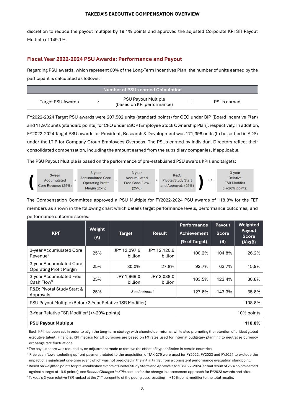 TAKEDA’S EXECUTIVE COMPENSATION OVERVIEW 8 discretion to reduce the payout multiple by 19.1% points and approved the adjusted Corporate KPI STI Payout Multiple of 149.1%. Fiscal Year 2022-2024 PSU Awards: Performance and Payout Regarding PSU awards, which represent 60% of the Long-Term Incentives Plan, the number of units earned by the participant is calculated as follows: Number of PSUs earned Calculation Target PSU Awards × PSU Payout Multiple (based on KPI performance) = PSUs earned FY2022-2024 Target PSU awards were 207,502 units (standard points) for CEO under BIP (Board Incentive Plan) and 11,972 units (standard points) for CFO under ESOP (Employee Stock Ownership Plan), respectively. In addition, FY2022-2024 Target PSU awards for President, Research & Development was 171,398 units (to be settled in ADS) under the LTIP for Company Group Employees Overseas. The PSUs earned by individual Directors reflect their consolidated compensation, including the amount earned from the subsidiary companies, if applicable. The PSU Payout Multiple is based on the performance of pre-established PSU awards KPIs and targets: The Compensation Committee approved a PSU Multiple for FY2022-2024 PSU awards of 118.8% for the TET members as shown in the following chart which details target performance levels, performance outcomes, and performance outcome scores: KPI1 Weight (A) Target Result Performance Achievement (% of Target) Payout Score (B) Weighted Payout Score (A)x(B) 3-year Accumulated Core Revenue2 25% JPY 12,097.6 billion JPY 12,126.9 billion 100.2% 104.8% 26.2% 3-year Accumulated Core Operating Profit Margin 25% 30.0% 27.8% 92.7% 63.7% 15.9% 3-year Accumulated Free Cash Flow3 25% JPY 1,969.0 billion JPY 2,038.0 billion 103.5% 123.4% 30.8% R&D: Pivotal Study Start & Approvals 25% See footnote 4 127.6% 143.3% 35.8% PSU Payout Multiple (Before 3-Year Relative TSR Modifier) 108.8% 3-Year Relative TSR Modifier5 (+/-20% points) 10% points PSU Payout Multiple 118.8% 1 Each KPI has been set in order to align the long-term strategy with shareholder returns, while also promoting the retention of critical global executive talent. Financial KPI metrics for LTI purposes are based on FX rates used for internal budgetary planning to neutralize currency exchange rate fluctuations. 2 The payout score was reduced by an adjustment made to remove the effect of hyperinflation in certain countries. 3 Free cash flows excluding upfront payment related to the acquisition of TAK-279 were used for FY2022, FY2023 and FY2024 to exclude the impact of a significant one-time event which was not predicted in the initial target from a consistent performance evaluation standpoint. 4 Based on weighted points for pre-established events of Pivotal Study Starts and Approvals for FY2022-2024 (actual result of 25.4 points earned against a target of 19.9 points); see Recent Changes in KPIs section for the change in assessment approach for FY2023 awards and after. 5 Takeda’s 3-year relative TSR ranked at the 71st percentile of the peer group, resulting in +10% point modifier to the total results.