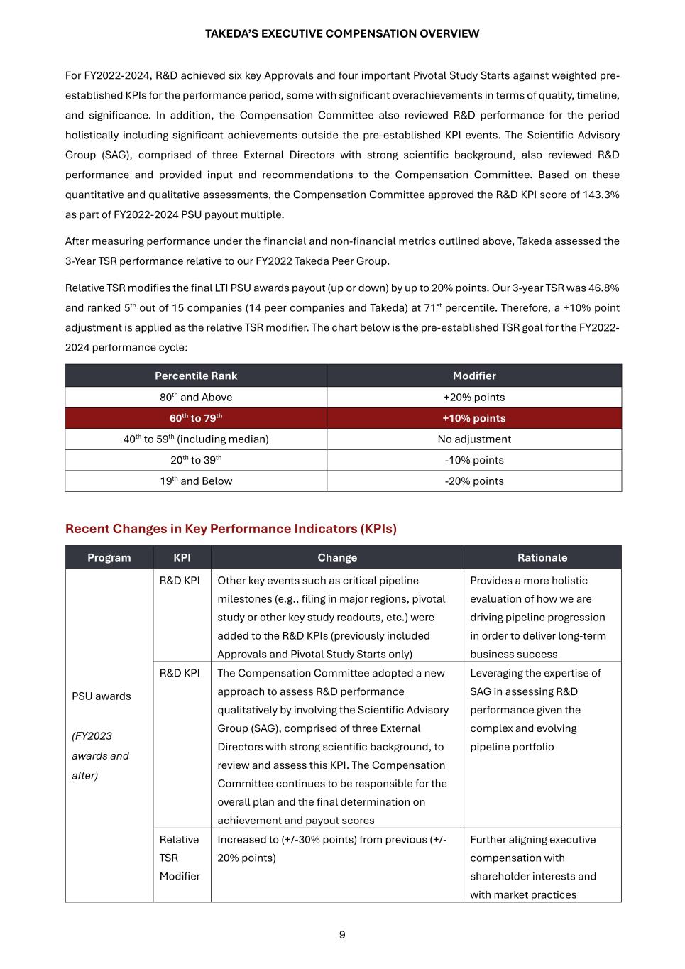 TAKEDA’S EXECUTIVE COMPENSATION OVERVIEW 9 For FY2022-2024, R&D achieved six key Approvals and four important Pivotal Study Starts against weighted pre- established KPIs for the performance period, some with significant overachievements in terms of quality, timeline, and significance. In addition, the Compensation Committee also reviewed R&D performance for the period holistically including significant achievements outside the pre-established KPI events. The Scientific Advisory Group (SAG), comprised of three External Directors with strong scientific background, also reviewed R&D performance and provided input and recommendations to the Compensation Committee. Based on these quantitative and qualitative assessments, the Compensation Committee approved the R&D KPI score of 143.3% as part of FY2022-2024 PSU payout multiple. After measuring performance under the financial and non-financial metrics outlined above, Takeda assessed the 3-Year TSR performance relative to our FY2022 Takeda Peer Group. Relative TSR modifies the final LTI PSU awards payout (up or down) by up to 20% points. Our 3-year TSR was 46.8% and ranked 5th out of 15 companies (14 peer companies and Takeda) at 71st percentile. Therefore, a +10% point adjustment is applied as the relative TSR modifier. The chart below is the pre-established TSR goal for the FY2022- 2024 performance cycle: Percentile Rank Modifier 80th and Above +20% points 60th to 79th +10% points 40th to 59th (including median) No adjustment 20th to 39th -10% points 19th and Below -20% points Recent Changes in Key Performance Indicators (KPIs) Program KPI Change Rationale PSU awards (FY2023 awards and after) R&D KPI Other key events such as critical pipeline milestones (e.g., filing in major regions, pivotal study or other key study readouts, etc.) were added to the R&D KPIs (previously included Approvals and Pivotal Study Starts only) Provides a more holistic evaluation of how we are driving pipeline progression in order to deliver long-term business success R&D KPI The Compensation Committee adopted a new approach to assess R&D performance qualitatively by involving the Scientific Advisory Group (SAG), comprised of three External Directors with strong scientific background, to review and assess this KPI. The Compensation Committee continues to be responsible for the overall plan and the final determination on achievement and payout scores Leveraging the expertise of SAG in assessing R&D performance given the complex and evolving pipeline portfolio Relative TSR Modifier Increased to (+/-30% points) from previous (+/- 20% points) Further aligning executive compensation with shareholder interests and with market practices