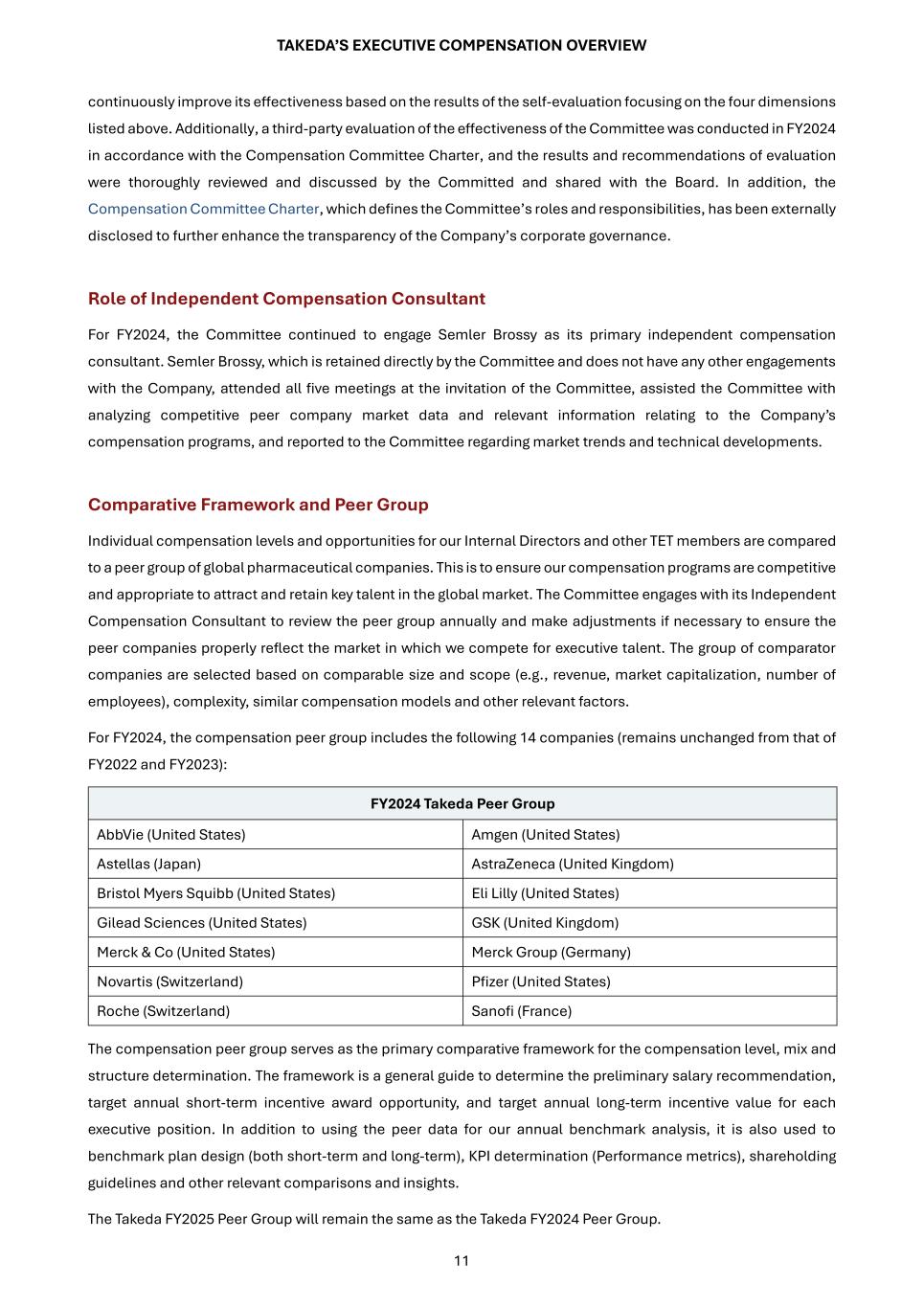 TAKEDA’S EXECUTIVE COMPENSATION OVERVIEW 11 continuously improve its effectiveness based on the results of the self-evaluation focusing on the four dimensions listed above. Additionally, a third-party evaluation of the effectiveness of the Committee was conducted in FY2024 in accordance with the Compensation Committee Charter, and the results and recommendations of evaluation were thoroughly reviewed and discussed by the Committed and shared with the Board. In addition, the Compensation Committee Charter, which defines the Committee’s roles and responsibilities, has been externally disclosed to further enhance the transparency of the Company’s corporate governance. Role of Independent Compensation Consultant For FY2024, the Committee continued to engage Semler Brossy as its primary independent compensation consultant. Semler Brossy, which is retained directly by the Committee and does not have any other engagements with the Company, attended all five meetings at the invitation of the Committee, assisted the Committee with analyzing competitive peer company market data and relevant information relating to the Company’s compensation programs, and reported to the Committee regarding market trends and technical developments. Comparative Framework and Peer Group Individual compensation levels and opportunities for our Internal Directors and other TET members are compared to a peer group of global pharmaceutical companies. This is to ensure our compensation programs are competitive and appropriate to attract and retain key talent in the global market. The Committee engages with its Independent Compensation Consultant to review the peer group annually and make adjustments if necessary to ensure the peer companies properly reflect the market in which we compete for executive talent. The group of comparator companies are selected based on comparable size and scope (e.g., revenue, market capitalization, number of employees), complexity, similar compensation models and other relevant factors. For FY2024, the compensation peer group includes the following 14 companies (remains unchanged from that of FY2022 and FY2023): FY2024 Takeda Peer Group AbbVie (United States) Amgen (United States) Astellas (Japan) AstraZeneca (United Kingdom) Bristol Myers Squibb (United States) Eli Lilly (United States) Gilead Sciences (United States) GSK (United Kingdom) Merck & Co (United States) Merck Group (Germany) Novartis (Switzerland) Pfizer (United States) Roche (Switzerland) Sanofi (France) The compensation peer group serves as the primary comparative framework for the compensation level, mix and structure determination. The framework is a general guide to determine the preliminary salary recommendation, target annual short-term incentive award opportunity, and target annual long-term incentive value for each executive position. In addition to using the peer data for our annual benchmark analysis, it is also used to benchmark plan design (both short-term and long-term), KPI determination (Performance metrics), shareholding guidelines and other relevant comparisons and insights. The Takeda FY2025 Peer Group will remain the same as the Takeda FY2024 Peer Group.