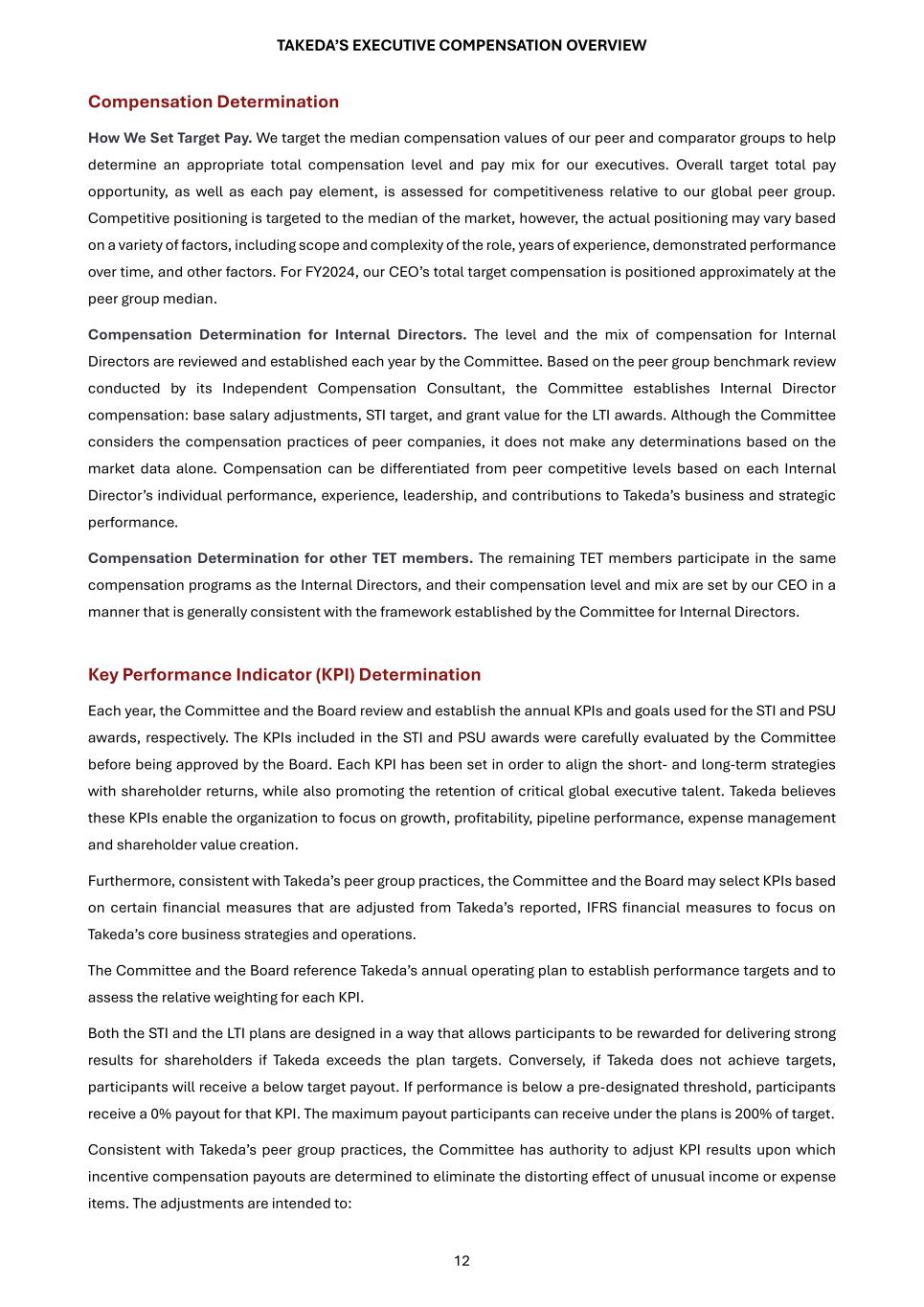 TAKEDA’S EXECUTIVE COMPENSATION OVERVIEW 12 Compensation Determination How We Set Target Pay. We target the median compensation values of our peer and comparator groups to help determine an appropriate total compensation level and pay mix for our executives. Overall target total pay opportunity, as well as each pay element, is assessed for competitiveness relative to our global peer group. Competitive positioning is targeted to the median of the market, however, the actual positioning may vary based on a variety of factors, including scope and complexity of the role, years of experience, demonstrated performance over time, and other factors. For FY2024, our CEO’s total target compensation is positioned approximately at the peer group median. Compensation Determination for Internal Directors. The level and the mix of compensation for Internal Directors are reviewed and established each year by the Committee. Based on the peer group benchmark review conducted by its Independent Compensation Consultant, the Committee establishes Internal Director compensation: base salary adjustments, STI target, and grant value for the LTI awards. Although the Committee considers the compensation practices of peer companies, it does not make any determinations based on the market data alone. Compensation can be differentiated from peer competitive levels based on each Internal Director’s individual performance, experience, leadership, and contributions to Takeda’s business and strategic performance. Compensation Determination for other TET members. The remaining TET members participate in the same compensation programs as the Internal Directors, and their compensation level and mix are set by our CEO in a manner that is generally consistent with the framework established by the Committee for Internal Directors. Key Performance Indicator (KPI) Determination Each year, the Committee and the Board review and establish the annual KPIs and goals used for the STI and PSU awards, respectively. The KPIs included in the STI and PSU awards were carefully evaluated by the Committee before being approved by the Board. Each KPI has been set in order to align the short- and long-term strategies with shareholder returns, while also promoting the retention of critical global executive talent. Takeda believes these KPIs enable the organization to focus on growth, profitability, pipeline performance, expense management and shareholder value creation. Furthermore, consistent with Takeda’s peer group practices, the Committee and the Board may select KPIs based on certain financial measures that are adjusted from Takeda’s reported, IFRS financial measures to focus on Takeda’s core business strategies and operations. The Committee and the Board reference Takeda’s annual operating plan to establish performance targets and to assess the relative weighting for each KPI. Both the STI and the LTI plans are designed in a way that allows participants to be rewarded for delivering strong results for shareholders if Takeda exceeds the plan targets. Conversely, if Takeda does not achieve targets, participants will receive a below target payout. If performance is below a pre-designated threshold, participants receive a 0% payout for that KPI. The maximum payout participants can receive under the plans is 200% of target. Consistent with Takeda’s peer group practices, the Committee has authority to adjust KPI results upon which incentive compensation payouts are determined to eliminate the distorting effect of unusual income or expense items. The adjustments are intended to: