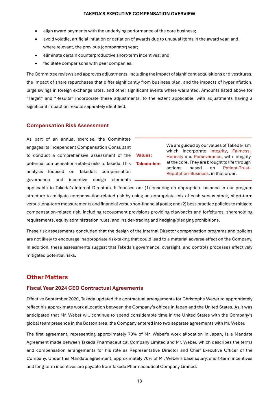 TAKEDA’S EXECUTIVE COMPENSATION OVERVIEW 13 • align award payments with the underlying performance of the core business; • avoid volatile, artificial inflation or deflation of awards due to unusual items in the award year, and, where relevant, the previous (comparator) year; • eliminate certain counterproductive short-term incentives; and • facilitate comparisons with peer companies. The Committee reviews and approves adjustments, including the impact of significant acquisitions or divestitures, the impact of share repurchases that differ significantly from business plan, and the impacts of hyperinflation, large swings in foreign exchange rates, and other significant events where warranted. Amounts listed above for “Target” and “Results” incorporate these adjustments, to the extent applicable, with adjustments having a significant impact on results separately identified. Compensation Risk Assessment As part of an annual exercise, the Committee engages its Independent Compensation Consultant to conduct a comprehensive assessment of the potential compensation-related risks to Takeda. This analysis focused on Takeda’s compensation governance and incentive design elements applicable to Takeda’s Internal Directors. It focuses on: (1) ensuring an appropriate balance in our program structure to mitigate compensation-related risk by using an appropriate mix of cash versus stock, short-term versus long-term measurements and financial versus non-financial goals; and (2) best-practice policies to mitigate compensation-related risk, including recoupment provisions providing clawbacks and forfeitures, shareholding requirements, equity administration rules, and insider-trading and hedging/pledging prohibitions. These risk assessments concluded that the design of the Internal Director compensation programs and policies are not likely to encourage inappropriate risk-taking that could lead to a material adverse effect on the Company. In addition, these assessments suggest that Takeda’s governance, oversight, and controls processes effectively mitigated potential risks. Other Matters Fiscal Year 2024 CEO Contractual Agreements Effective September 2020, Takeda updated the contractual arrangements for Christophe Weber to appropriately reflect his approximate work allocation between the Company’s offices in Japan and the United States. As it was anticipated that Mr. Weber will continue to spend considerable time in the United States with the Company’s global team presence in the Boston area, the Company entered into two separate agreements with Mr. Weber. The first agreement, representing approximately 70% of Mr. Weber’s work allocation in Japan, is a Mandate Agreement made between Takeda Pharmaceutical Company Limited and Mr. Weber, which describes the terms and compensation arrangements for his role as Representative Director and Chief Executive Officer of the Company. Under this Mandate agreement, approximately 70% of Mr. Weber’s base salary, short-term incentives and long-term incentives are payable from Takeda Pharmaceutical Company Limited. Values: Takeda-ism We are guided by our values of Takeda-ism which incorporate Integrity, Fairness, Honesty and Perseverance, with Integrity at the core. They are brought to life through actions based on Patient-Trust- Reputation-Business, in that order.