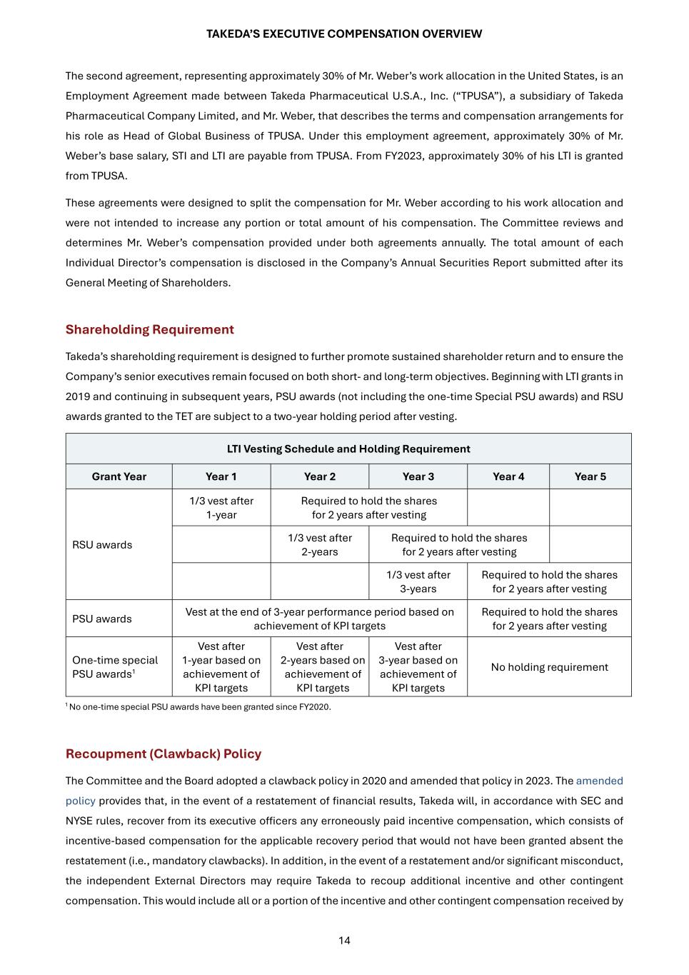 TAKEDA’S EXECUTIVE COMPENSATION OVERVIEW 14 The second agreement, representing approximately 30% of Mr. Weber’s work allocation in the United States, is an Employment Agreement made between Takeda Pharmaceutical U.S.A., Inc. (“TPUSA”), a subsidiary of Takeda Pharmaceutical Company Limited, and Mr. Weber, that describes the terms and compensation arrangements for his role as Head of Global Business of TPUSA. Under this employment agreement, approximately 30% of Mr. Weber’s base salary, STI and LTI are payable from TPUSA. From FY2023, approximately 30% of his LTI is granted from TPUSA. These agreements were designed to split the compensation for Mr. Weber according to his work allocation and were not intended to increase any portion or total amount of his compensation. The Committee reviews and determines Mr. Weber’s compensation provided under both agreements annually. The total amount of each Individual Director’s compensation is disclosed in the Company’s Annual Securities Report submitted after its General Meeting of Shareholders. Shareholding Requirement Takeda’s shareholding requirement is designed to further promote sustained shareholder return and to ensure the Company’s senior executives remain focused on both short- and long-term objectives. Beginning with LTI grants in 2019 and continuing in subsequent years, PSU awards (not including the one-time Special PSU awards) and RSU awards granted to the TET are subject to a two-year holding period after vesting. LTI Vesting Schedule and Holding Requirement Grant Year Year 1 Year 2 Year 3 Year 4 Year 5 RSU awards 1/3 vest after 1-year Required to hold the shares for 2 years after vesting 1/3 vest after 2-years Required to hold the shares for 2 years after vesting 1/3 vest after 3-years Required to hold the shares for 2 years after vesting PSU awards Vest at the end of 3-year performance period based on achievement of KPI targets Required to hold the shares for 2 years after vesting One-time special PSU awards1 Vest after 1-year based on achievement of KPI targets Vest after 2-years based on achievement of KPI targets Vest after 3-year based on achievement of KPI targets No holding requirement 1 No one-time special PSU awards have been granted since FY2020. Recoupment (Clawback) Policy The Committee and the Board adopted a clawback policy in 2020 and amended that policy in 2023. The amended policy provides that, in the event of a restatement of financial results, Takeda will, in accordance with SEC and NYSE rules, recover from its executive officers any erroneously paid incentive compensation, which consists of incentive-based compensation for the applicable recovery period that would not have been granted absent the restatement (i.e., mandatory clawbacks). In addition, in the event of a restatement and/or significant misconduct, the independent External Directors may require Takeda to recoup additional incentive and other contingent compensation. This would include all or a portion of the incentive and other contingent compensation received by