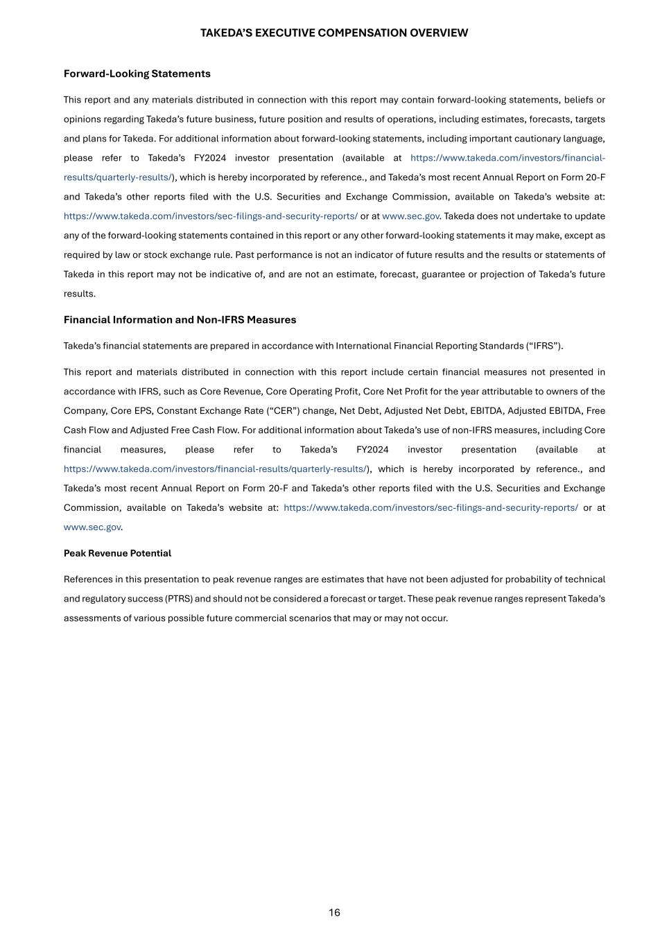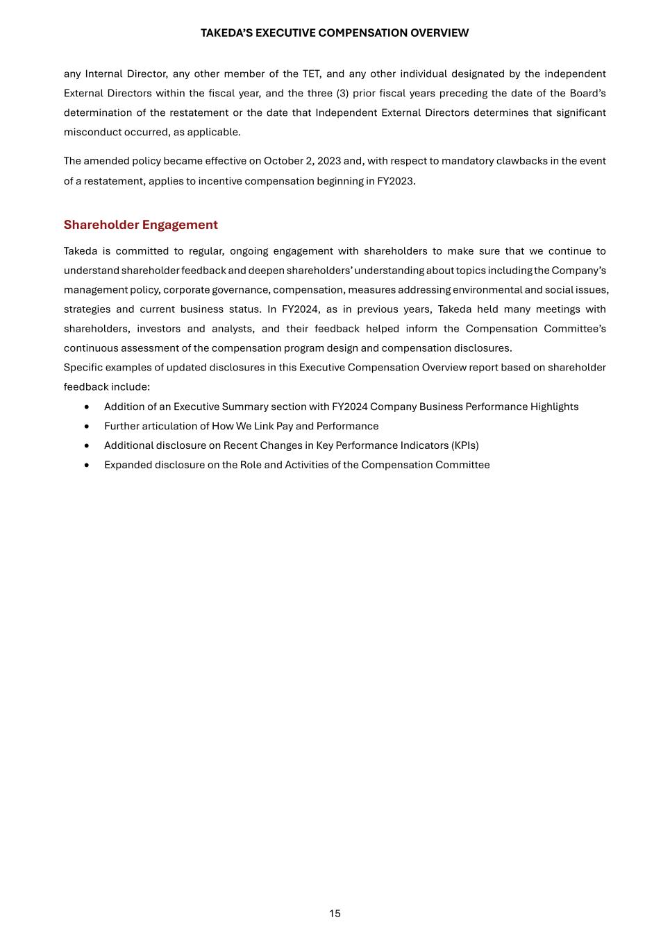 TAKEDA’S EXECUTIVE COMPENSATION OVERVIEW 15 any Internal Director, any other member of the TET, and any other individual designated by the independent External Directors within the fiscal year, and the three (3) prior fiscal years preceding the date of the Board’s determination of the restatement or the date that Independent External Directors determines that significant misconduct occurred, as applicable. The amended policy became effective on October 2, 2023 and, with respect to mandatory clawbacks in the event of a restatement, applies to incentive compensation beginning in FY2023. Shareholder Engagement Takeda is committed to regular, ongoing engagement with shareholders to make sure that we continue to understand shareholder feedback and deepen shareholders’ understanding about topics including the Company’s management policy, corporate governance, compensation, measures addressing environmental and social issues, strategies and current business status. In FY2024, as in previous years, Takeda held many meetings with shareholders, investors and analysts, and their feedback helped inform the Compensation Committee’s continuous assessment of the compensation program design and compensation disclosures. Specific examples of updated disclosures in this Executive Compensation Overview report based on shareholder feedback include: • Addition of an Executive Summary section with FY2024 Company Business Performance Highlights • Further articulation of How We Link Pay and Performance • Additional disclosure on Recent Changes in Key Performance Indicators (KPIs) • Expanded disclosure on the Role and Activities of the Compensation Committee